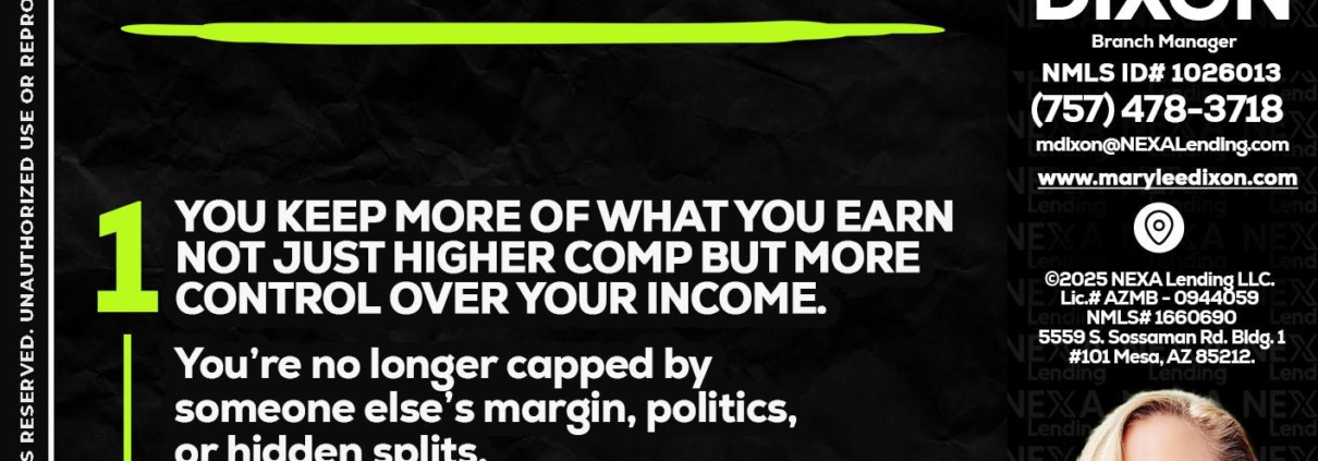 7 THINGS (1) - Marylee Dixon -Branch ManagerHi, my name is Marylee Dixon. I’m a Loan Officer with NEXA Lending LLC., offering personalized mortgage solutions, fast customized quotes, great rates and service with integrity.