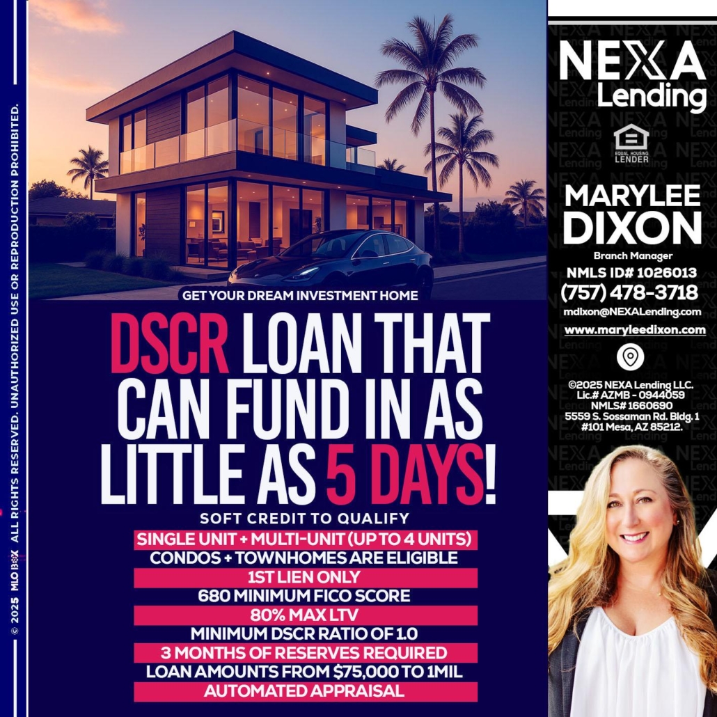 Hi, my name is Marylee Dixon. I’m a Loan Officer with NEXA Mortgage LLC., offering personalized mortgage solutions, fast customized quotes, great rates and service with integrity.
