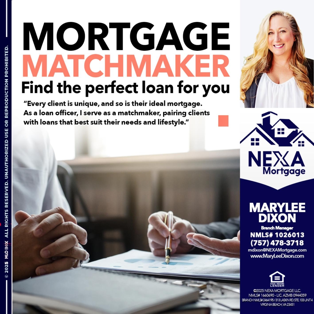 Hi, my name is Marylee Dixon. I’m a Loan Officer with NEXA Mortgage LLC., offering personalized mortgage solutions, fast customized quotes, great rates and service with integrity.