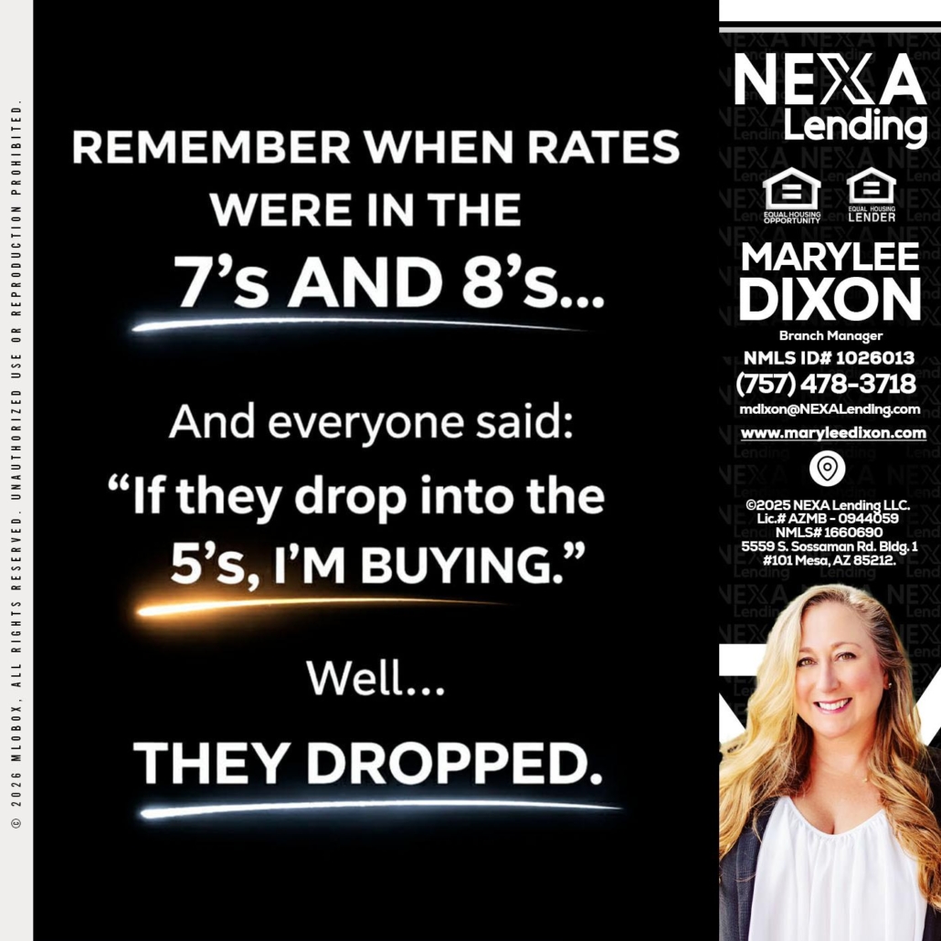 Hi, my name is Marylee Dixon. I’m a Loan Officer with NEXA Lending LLC., offering personalized mortgage solutions, fast customized quotes, great rates and service with integrity.