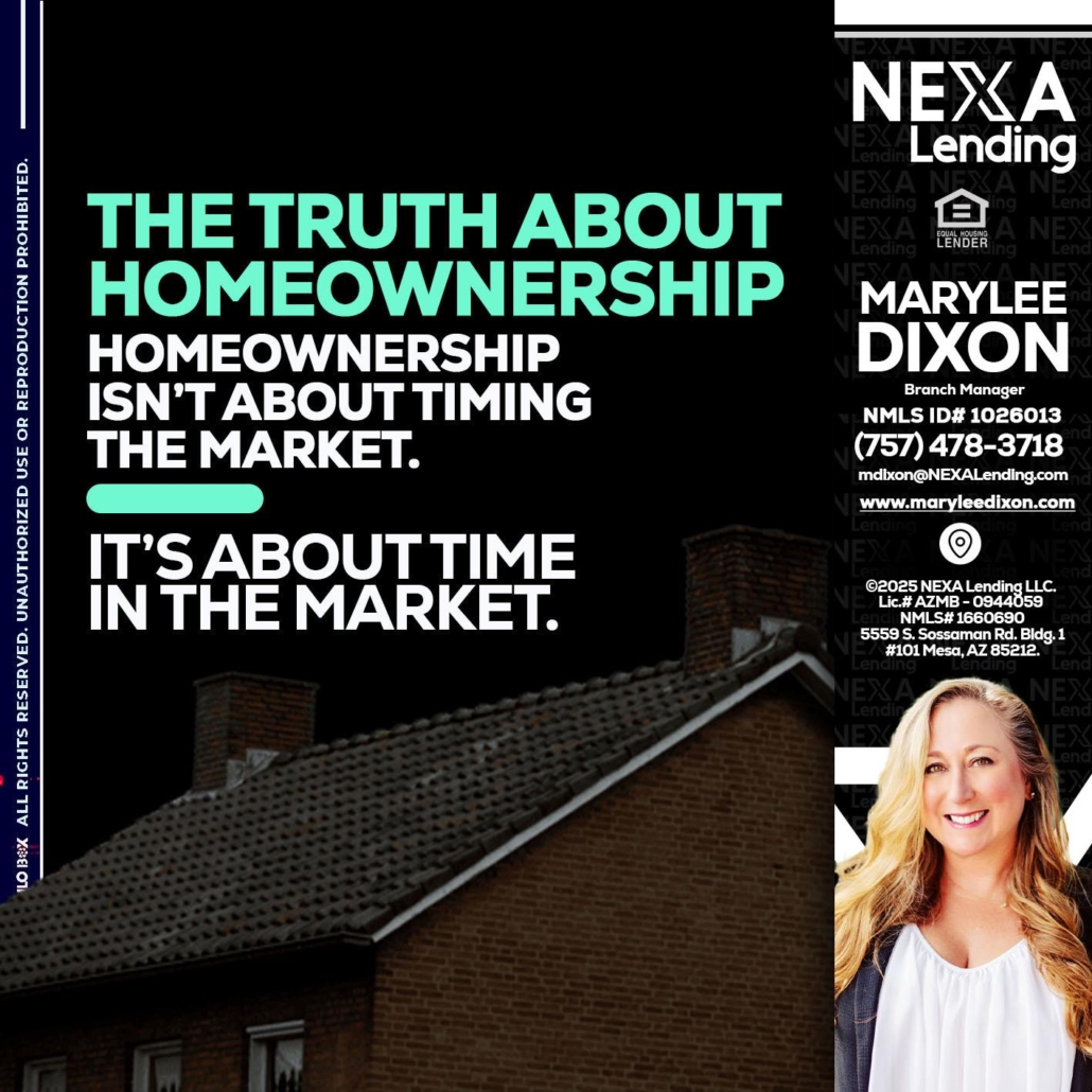 THE TRUTH ABOUT - Marylee Dixon -Branch ManagerHi, my name is Marylee Dixon. I’m a Loan Officer with NEXA Mortgage LLC., offering personalized mortgage solutions, fast customized quotes, great rates and service with integrity.