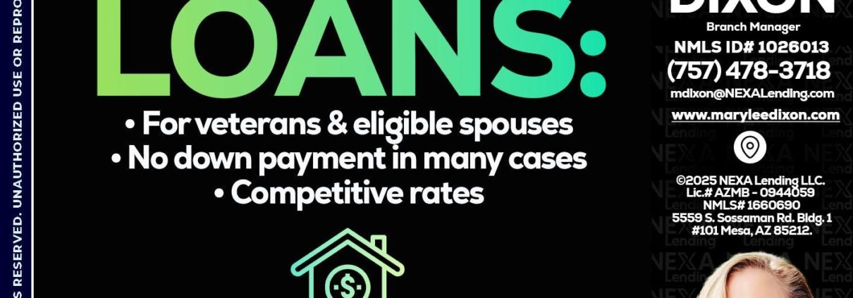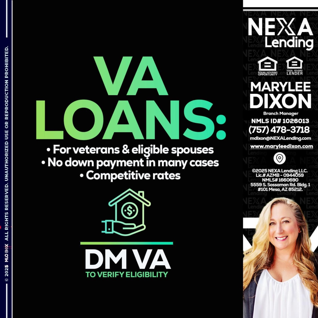 VA LOANS - Marylee Dixon -Branch ManagerHi, my name is Marylee Dixon. I’m a Loan Officer with NEXA Lending LLC., offering personalized mortgage solutions, fast customized quotes, great rates and service with integrity.