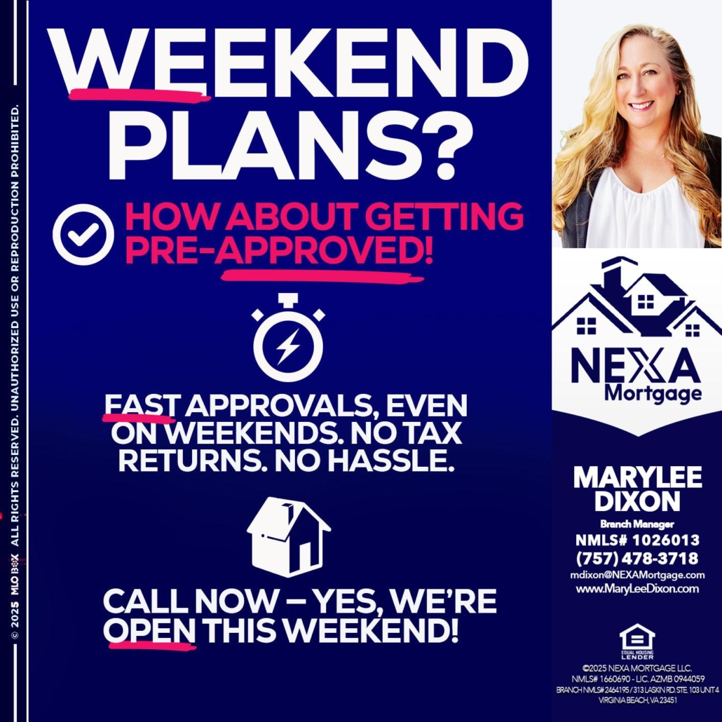Hi, my name is Marylee Dixon. I’m a Loan Officer with NEXA Mortgage LLC., offering personalized mortgage solutions, fast customized quotes, great rates and service with integrity.