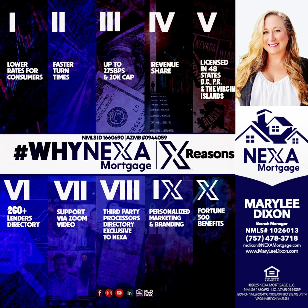 Hi, my name is Marylee Dixon. I’m a Loan Officer with NEXA Mortgage LLC., offering personalized mortgage solutions, fast customized quotes, great rates and service with integrity.