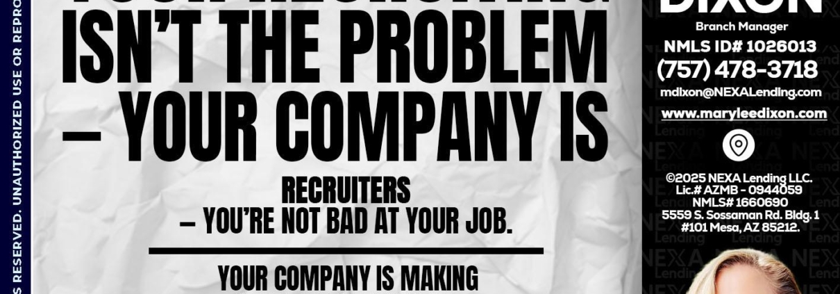 YOUR RECRUITING - Marylee Dixon -Branch ManagerHi, my name is Marylee Dixon. I’m a Loan Officer with NEXA Mortgage LLC., offering personalized mortgage solutions, fast customized quotes, great rates and service with integrity.